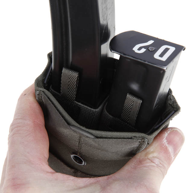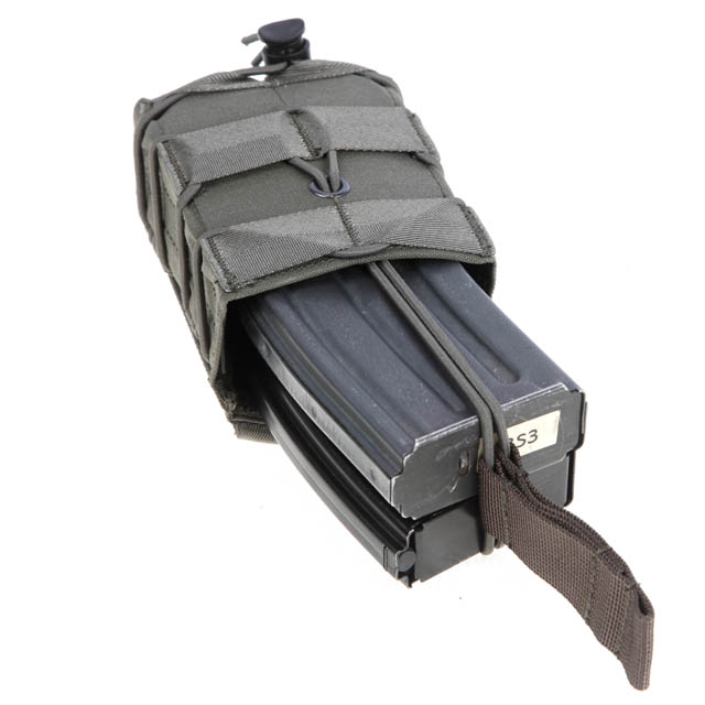 Bra om man jobbar i trånga utrymmen, t.ex i luckan på ett fordon. Magasinet säkras med ett elastiskt snöre med grepp. Greppet är särskilt utformat för att inte glida mot en sluttande magasinbotten (ex. HK416). Passar självklart att ha på bältet, MOLLE-system (vapenväst, ryggsäck etc.) men även för SV2000 och det gamla 20 mm systemet.