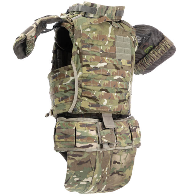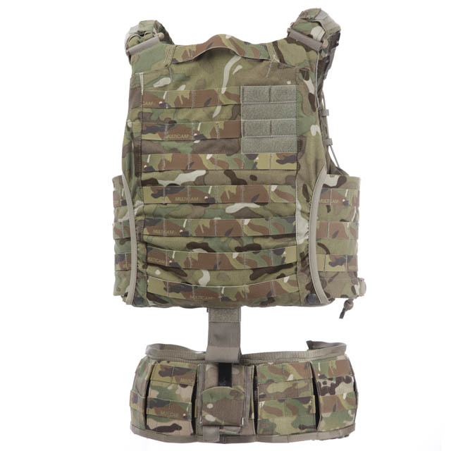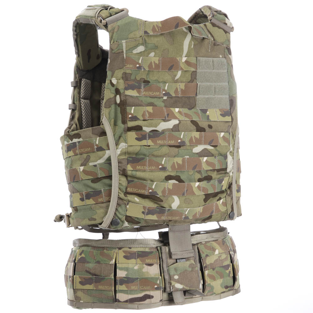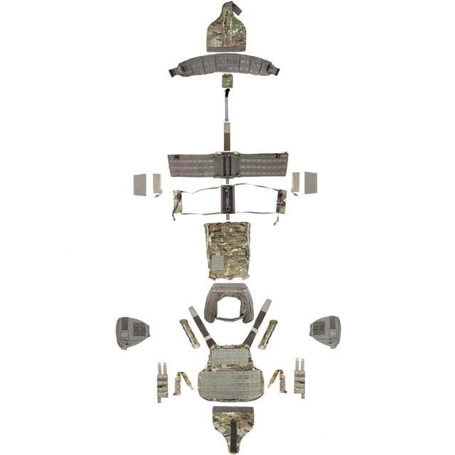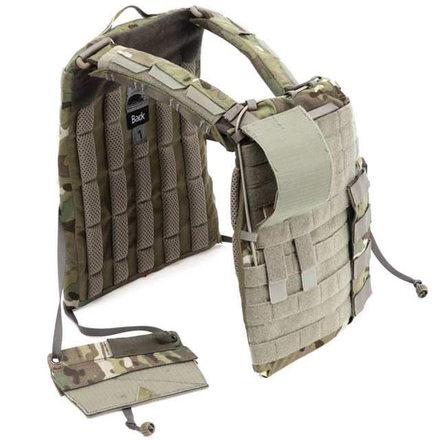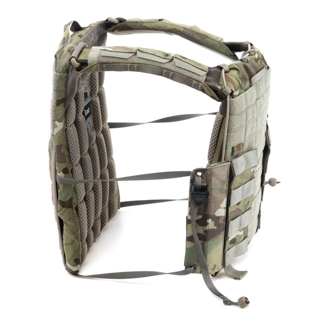 - MOLLE webbing fram och bak. En fästpunkt på varje axel för ett reparationsspänne för att fästa en ryggsäck. Två fästpunkter under MOLLE-banden på bröstet för reparationsspännen för att fästa bröstpanelen. En elastisk lina placeras runt kanten av fronten för att hålla hydreringsrör eller kablar.