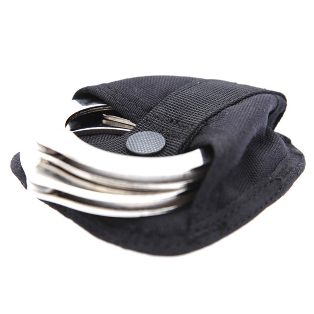 En lätt ficka för handfängsel från svenska Snigel Design som hindrar skrammel och som är enkel att använda, montera och demontera på utrustningsbältet.