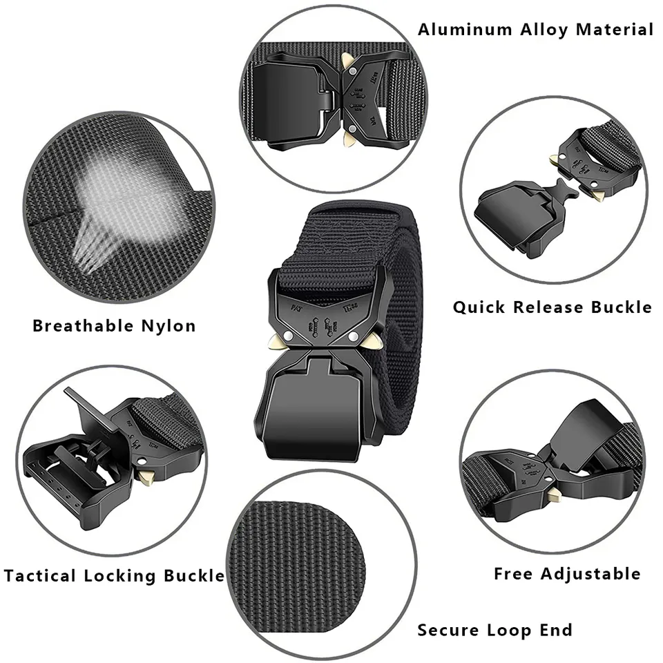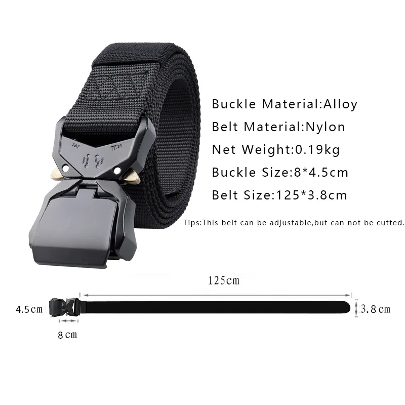 Du behöver endast klicka på sido-tänderna på spännet för att låsa upp bältet eller dra upp bygeln för att lätta / dra åt. Tillverkad av nylon och Zink alloy-spänne som är utvecklad främst för polis och militärbruk.